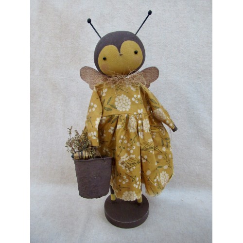 This adorable bee stands approximately 15 inches. Her body and head are made from osnaburg and her legs are dowels. She stands on a 3 1/2 inch wood round. Her head is hand painted as are her legs. She wears a coffee stained yellow floral fabric(fabric may vary) dress, her wings are stained flannel and her antennae and ‘stinger’ are painted toothpicks. Tiny black pom poms top off her antennae. She holds a painted peat pot filled with Spanish moss, preserved Sweet Annie and a tiny bee. The picture doesn’t capture her cuteness