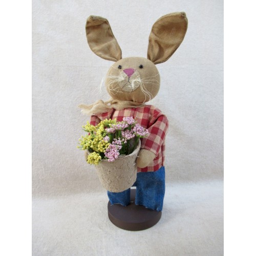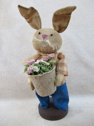 He is the cutest! Made from coffee stained osnaburg he wears a plaid homespun shirt in your choice of red or yellow( the color makes me think of the maize crayon in the Crayola box) and blue denim pants. His nose is hand painted and he has black bead eyes. He holds a peat pot filled with Spanish moss and a combination of white, pink or yellow flowers. His legs are dowels and he stands on a 3 1/2 inch wood round. Approximately 13 inches tall depending on how his ears are bent
