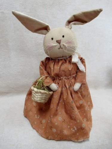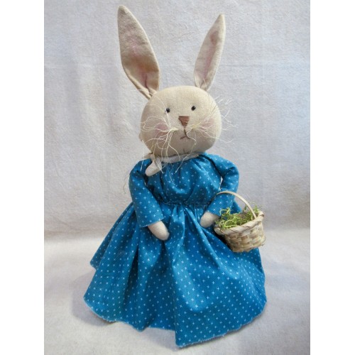 Rosie is an adorable primitive bunny that stands approximately 13”. She is made from coffee stained osnaburg, has bead eyes and a hand stitched nose. She wears a dress in a your choice of teal or rust. Rosie carries a small basket filled with green Spanish moss.
