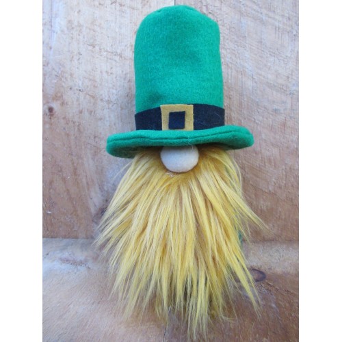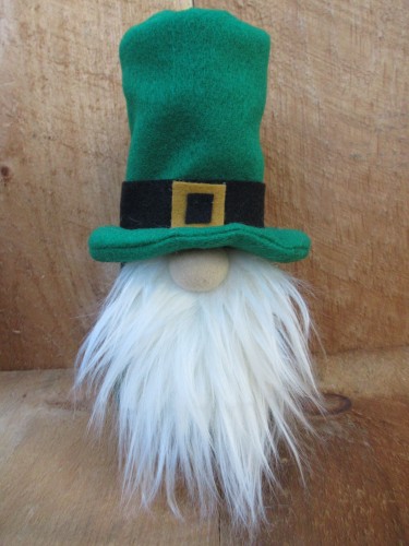 Made from green felt Leprechaun gnome stands approximately 9 1/2 inches. His hat, hat band and buckle are also made from felt and his nose is made from fleece. His beard is available in either ivory or gold faux fur. He’s been a top seller!
