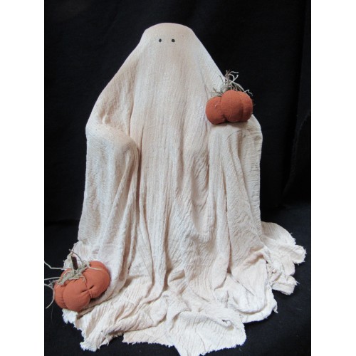 A top seller for years!! "Ghost" stands approximately 10" tall. He has a muslin body, wire wrapped arms and is draped with gauze which has been stiffened with fabric stiffener. To give a worn look, Ghost is sprayed with a wood tone spray. Two handmade pumpkins accent.