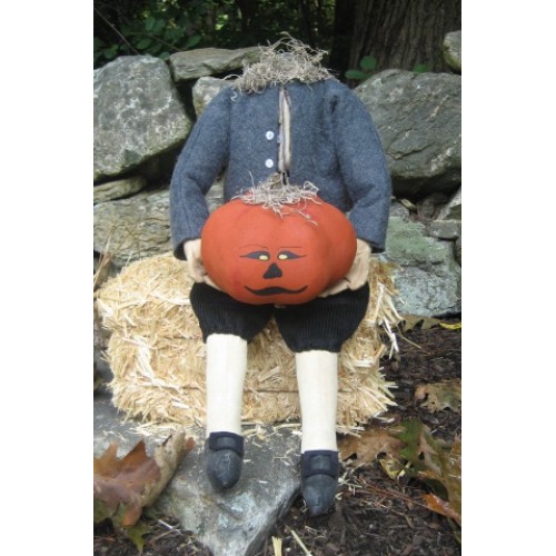 "Jack" is a 24 inch doll made from stained and painted muslin. He wears black corduroy britches, a wool felt jacket and a stained ticking shirt. His shoes have little black wool felt buckles. In his hands he hold his "head" made from painted and stained muslin. "Jack" is sure to be a top seller!