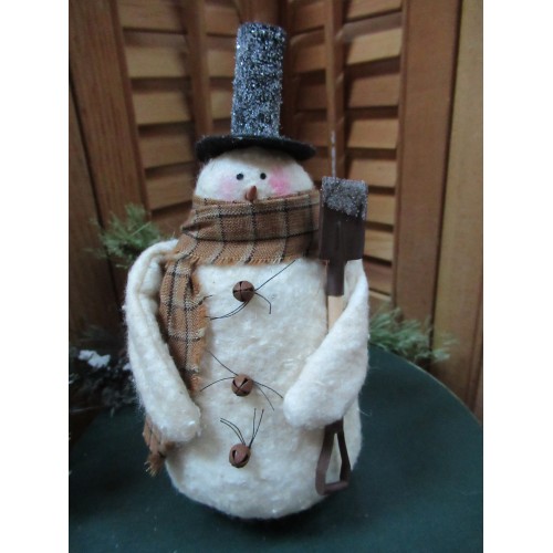 Standing approximately 6" tall Baby Frosty is made from stained warm and natural batting. He wears a homespun scarf, a black felt hat and has tiny rusty bell buttons. He hold a tiny rusty shovel and is sprinkled with German Glass Glitter. Scarf fabric may vary.