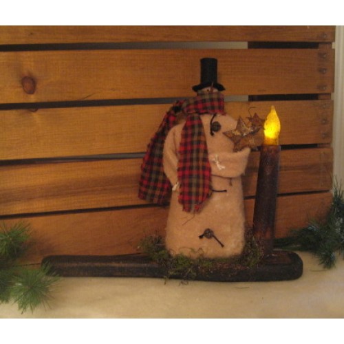 This snowman would be a unique rustic holiday/winter decoration. The 9-inch snowman is made from dyed warm and natural and wears a top hat, homespun scarf and three rusty bell buttons. In his arm he hold rusty stars. He stands on an old prim candle paddle with a bit of moss ribbon. A 6-inch battery operated grungy candle is included. Scarf fabric may vary.