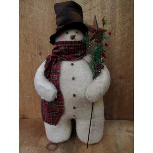 A number 1 best seller!! Chubby Charles is made from plush felt which has been coffee stain to give an aged look. His hat is made from black felt which has been sprinkled with cinnamon to, again, give an aged look. His eyes and buttons are allspice and his nose is a sharpend pencil painted and rolled in cinnamon. He holds a rusty star pick with greens and red pip berries. Chubby Charles stands approximately 17 inches tall and has a nice round belly.