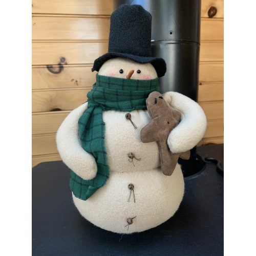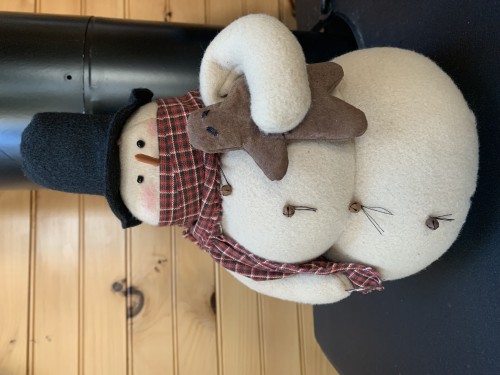 Sam is made from tan fleece and stands approximately 10” tall. He wears a homespun scarf in your choice of red or green and a black felt hat. His eyes are black bead and his four ‘buttons’ art tiny rusty bells. In his arm he hold a little gingerbread man made from muslin which has been painted, stained and sprinkle with a spice mix.