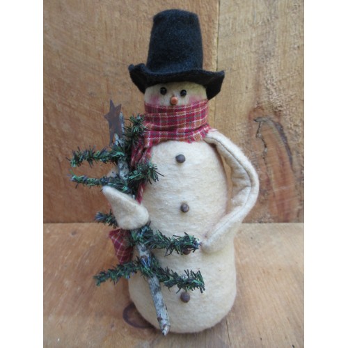 A top seller! Made from coffee/tea stained warm and natural batting this handsome snowman stands approximately 9". He wears a homespun scarf and a black felt hat that has been sprinkled with cinnamon. The primitive little tree is made from German twig pine wrapped around a stick and topped with a rusty star. Scarf fabric may vary.