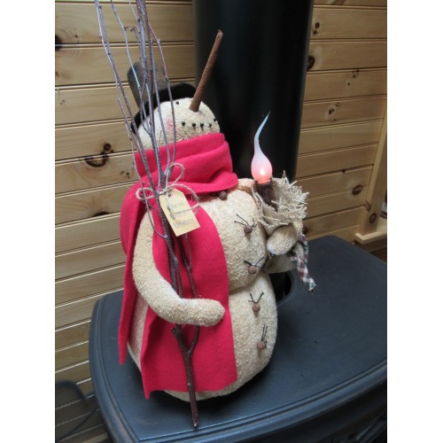 This 17" snowman is made from coffee stained Terry cloth and wears. black felt top hat and red fleece scarf. His buttons are rusty bells and his nose is made from warm and natural batting. He holds a 5-inch electric Cale lamp in one arm and a small bunch of birch branches in theater. The little tag read"Warm Winter Wishes". SnowWishin has been my top selling snowman!!!