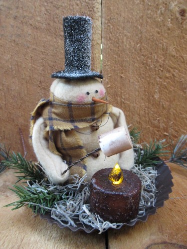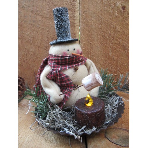 This adorable 6" snowman is made from fleece. He sits in a 5" rusty candlepin decorated with greens pip berries and Spanish moss. He wears a homespun scarf in your choice of red or mustard, a black felt hat and has tiny rusty bell buttons. His "toasted" marshmallow is attached to a piece of rusty wire and is held over a grungy tea light(included). The red scarf is out of stock.