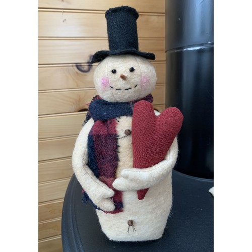 This handsome guy is made from stained warm and natural and stands approximately 10 1/4”. He wears a red/ navy scarf and a black felt hat. His eyes are stitched on beads, his nose is a painted skewer and his ‘buttons’ are tiny rusty bells. He holds a red heart made from homespun fabric. Waiting patiently to give his Valentine his heart.
