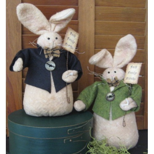 This 10-inch bunny is made from dyed Warm and Natural. He wears wool felt coat in your choice of black or green and a homespun bow tie. His eyes are tiny black beads and his nose is hand stitched. In his hand he holds a sign that reads "Faith, Family, Friends".