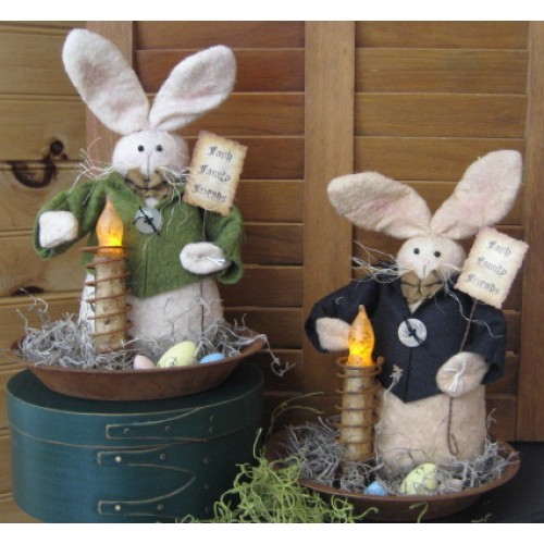 This bunny is made from dyed Warm and Natural and wears a coat of either green or black wool felt and a little homespun bow tie. He hold a sign that reads "Faith, Family, Friends" and sits in a 7-inch rusty pie pan. A 4-inch grungy battery-operated candle sits in a rusty spiral holder. Spanish moss and colored wooden eggs are also included.