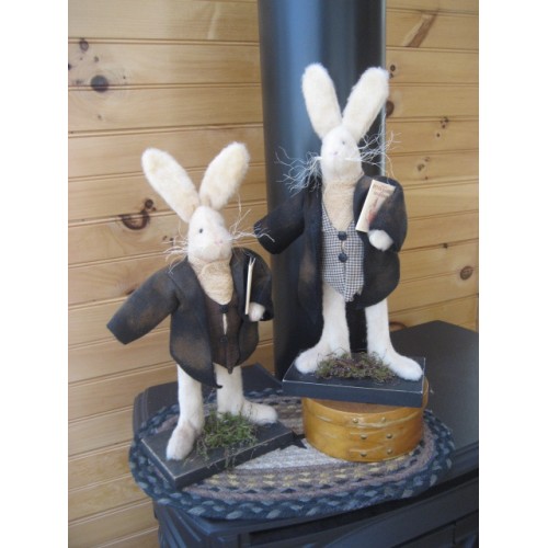 This handsome bunny stands approximately 14 inches. He is made from coffee stained plush felt and wears a black fleece coat sprinkled with cinnamon, a tan homespun vest and a coffee stained cheesecloth scarf. In his hand he holds a book titled "The Tales of Peter Rabbit and His Friends". Mr. Thumper stands on a 6-inch piece of wood accented with moss.