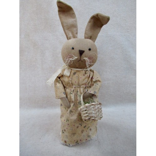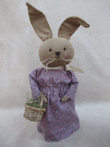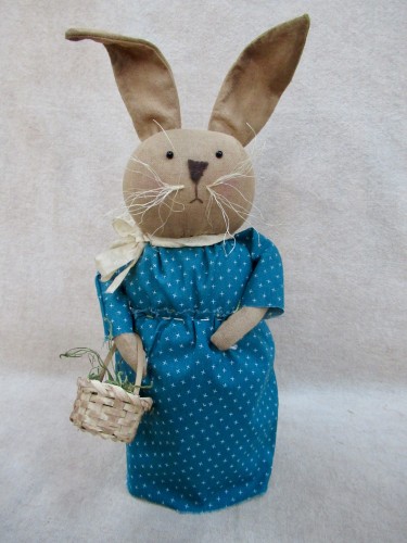 Rosie is an adorable primitive bunny that stands approximately 13”. She is made from coffee stained osnaburg, has bead eyes and a hand stitched nose. She wears a dress in a your choice of teal, yellow or lavender. Rosie carries a small basket filled with green Spanish moss. Temporarily out of