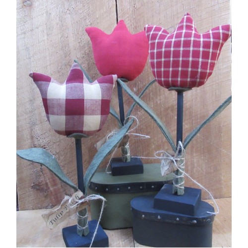 This tulip stands approximately 12 inches tall and is made from homespun fabric. The leaves are made from green wool felt. The tulip is attached to a painted dowel and "stands" on a square wood base. A little tag that reads "Tulip Patch" is attached. A nice Spring accent! PLEASE note that each tulip is sold individually not as a set.